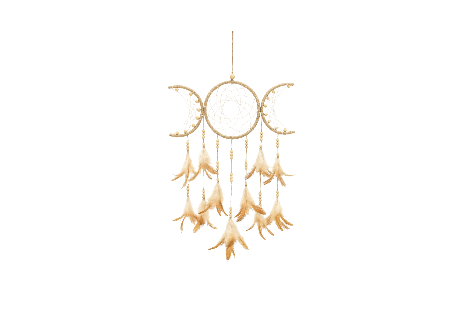 Este atrapa sueños representa el símbolo sagrado de la Triple Luna, reflejando las tres fases de la vida y de la energía femenina: la Doncella (renacimiento y esperanza), la Madre (creación y amor) y la Anciana (sabiduría y transformación).
