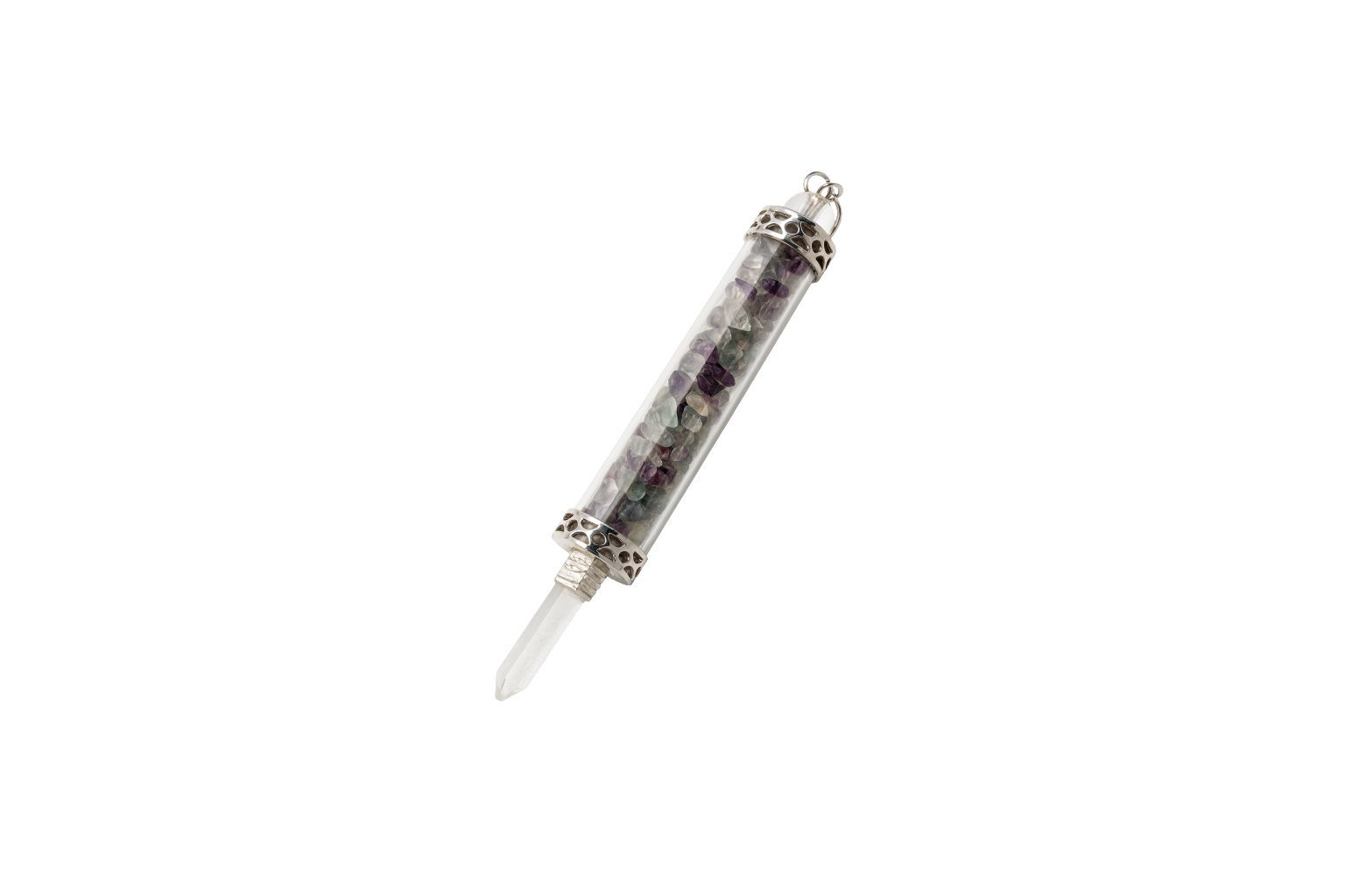 Esta es una varita de poder con fluorita, elaborada con fragmentos de esta piedra dentro de un tubo transparente de cristal y una punta de cuarzo que canaliza la energía.