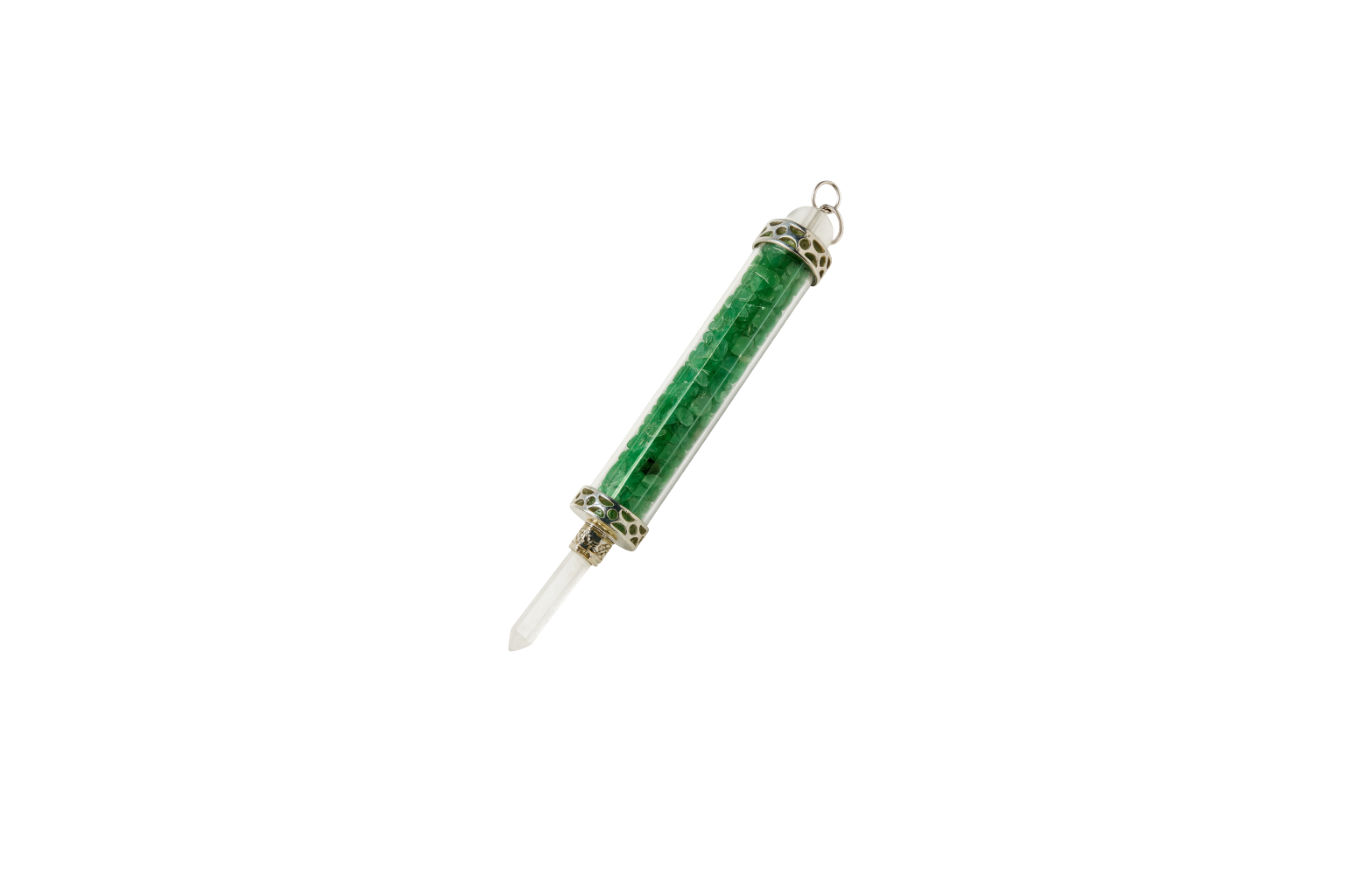 Esta es una varita de poder con jade verde, formada por fragmentos de esta piedra dentro de un tubo transparente y una punta de cuarzo que canaliza la energía.